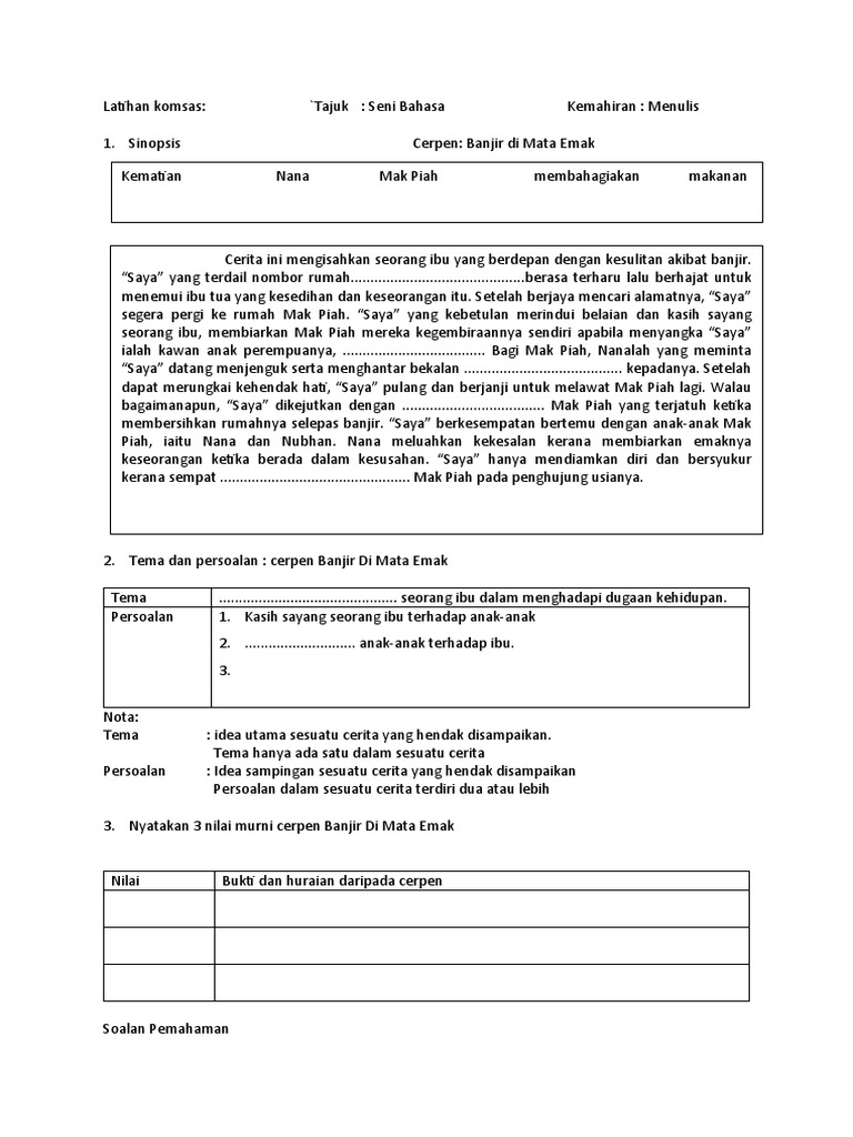 → → < koleksi nota ringkas dan padat, soalan, latihan, modul, jawapan tingkatan 1, 2, 3, 4, 5 dan. Pencerita menggunakan kata ganti diri 'saya' bagi menggambarkan. Peningkatan jumlah melanin di kulit sekitar mata, misalnya akibat paparan sinar matahari berlebihan. Aisyah najwa 6 months ago. Posted on january 12, 2019 by admin. Kontrak latihan bahasa melayu tingkatan 2 bahagian d : Mimpi melihat banjir banyak juga menafsirkan angka kode alam banjir yang dimuat dalam erek erek kebanjiran 2d 3d maupun 4d. Banjir di mata emak ( che soo ismail ) √ 6 2. Kim老师 komsas 最强解析 之 tingkatan 2 cerpen: Cerpen komsas tingkatan 2 pendahuluan cerpen yang termuat mulai muka surat 51 hingga 57, antologi baik budi, indah bahasa ini disampaikan menerusi sudut pandangan orang pertama. Documents similar to komsas tingkatan2 2016. Novel bahasa melayu tingkatan 2 (nukilan juri durabi) novel ini bermula tahun 2016 sehingga 2019 sinopsis penuh. Setelah tubuh mak piah kaku, barulah semoga perkongsian ini iaitu nota cerpen banjir di mata emak dapat memberikan sedikt sebanyak manfaat kepada anda khususnya kepada.
