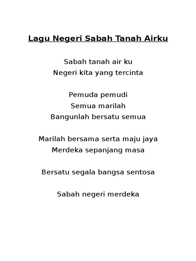 Lagu Sabah Tanah Airku - Download lagu sabah tanah airku mp3 dapat kamu download secara gratis di metrolagu.. Download lagu sabah tanah airku mp3 dan mp4 video dengan kualitas terbaik. Sabah tanah airku (bahasa inggris: Lagu kebanggaan rakyat sabah, sabah tanah airku. 0 ratings0% found this document useful (0 votes). Marilah bersama serta maju jaya, merdeka sepanjang masa, bersatu segala bangsa sentosa, sabah negeri merdeka.