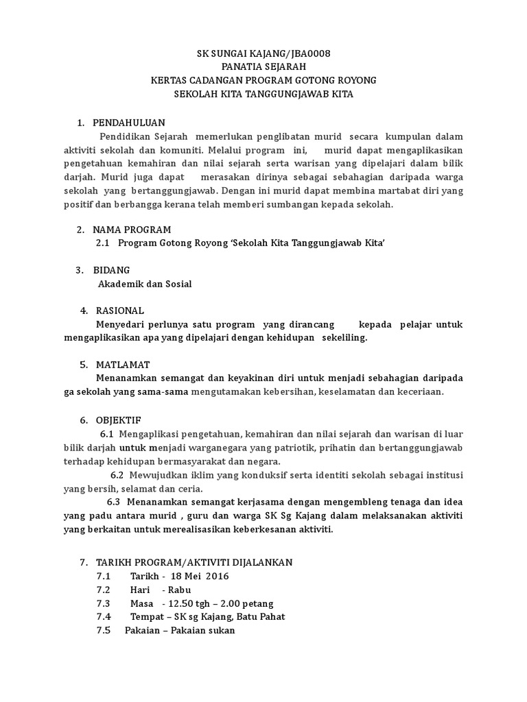 Kertas Kerja Gotong Royong Pk from imgv2-2-f.scribdassets.com Kertas kerja program khitan jama'ie 2014 sk taman jana 'kebersihan jiwa melalui kebersihan fizikal' oleh: Kabinet ini diumumkan pada 9 agustus 2001. Menampal lubang 4.2 fasa 2 10.50 12.30 tgh mengecat pintu dan dinding tandas serta pintu bilik bilik khas 5.0 tentatif program masa aktiviti 8.00 8.30 pagi pendaftaran 8.30 8.35 pagi bacaan doan 8.35 8.40 pagi ucapan aluan daripada guru besar. Melalui aktiviti gotong royong ini, warga sekolah juga boleh. Kertas kerja gotong royong perdana. Mesyuarat bersama ahli jawatankuasa yang terlibat dengan program. Kertas kerja program gotong royong peringkat asrama smk tinggi perempuan melaka 2018. Report kertas kerja gotong royong.