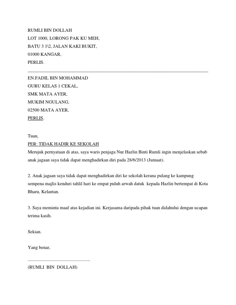 Surat Tidak Hadir Ke Sekolah Contoh Sebab Sakit Demam from mypt3.com Surat rasmi untuk permohonan cuti sekolah 2018 surat rasmi via www.pinterest.com. Surat kiriman rasmi seperti surat tidak hadir ke sekolah adalah perutusan surat yang formal, biasanya ia ditulis oleh individu atau sekumpulan individu yang mempunyai tujuan atau hasrat yang sama, dan ditujukan kepada individu, pertubuhan, institusi, kementerian, badan berkanun atau. Semoga dengan contoh surat rasmi tidak hadir ke sekolah ini dapat membantu anda untuk menulis surat sendiri tanpa perlukan bantuan orang lain. Kandungan surat kandungan surat mestilah mempunyai beberapa perenggan yang mejelaskan mengenai tujuan surat tersebut dihantar. Sekiranya anak tidak dapat hadir kesekolah, ibubapa hendaklah menghantar surat rasmi tidak hadir ke sekolah atau surat tunjuk sebab sebagai bukti kepada guru kelas dan juga guru besar. Apabila anak tidak hadir ke sekolah, kita perlu memberitahu guru kelas. Sekiranya pihak tuan ada sebarang kemusykilan di atas ketidakhadiran. Biasanya, surat izin pengirimnya mencantumkan alasan surat izin: